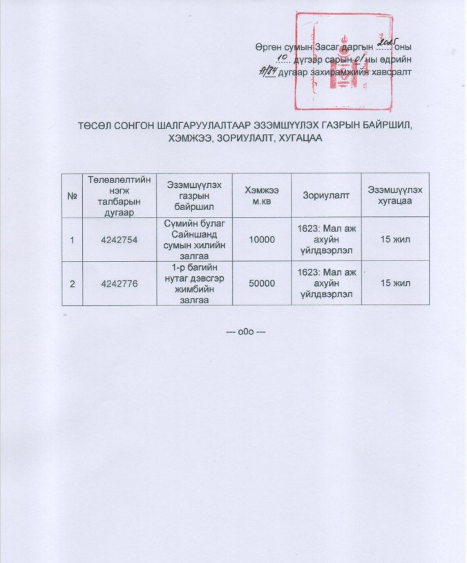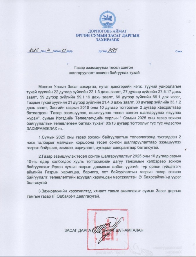 ӨРГӨН СУМАНД МАЛЧДЫН ХОРШООНД ГАЗАР ЭЗЭМШҮҮЛЭХ ТӨСӨЛ СОНГОН ШАЛГАРУУЛАЛТ ЗОХИОН БАЙГУУЛАГДАНА.