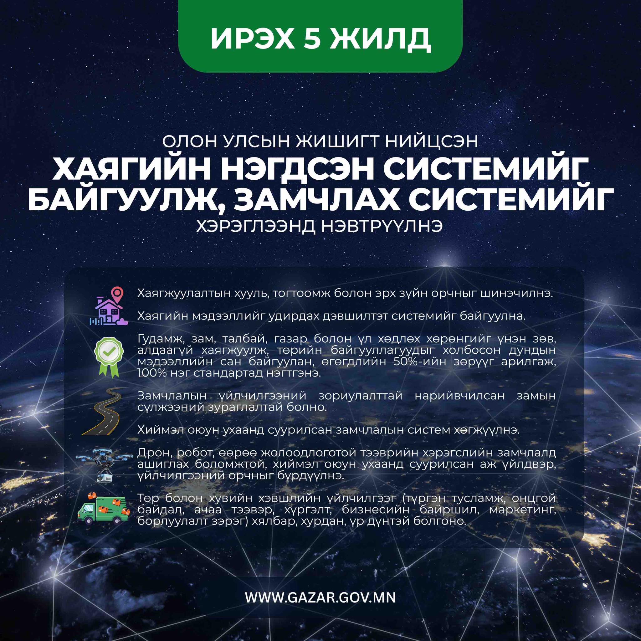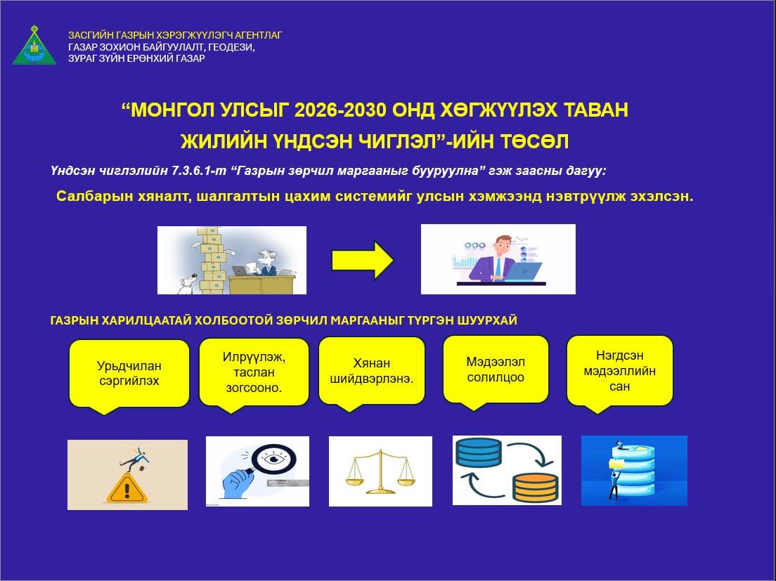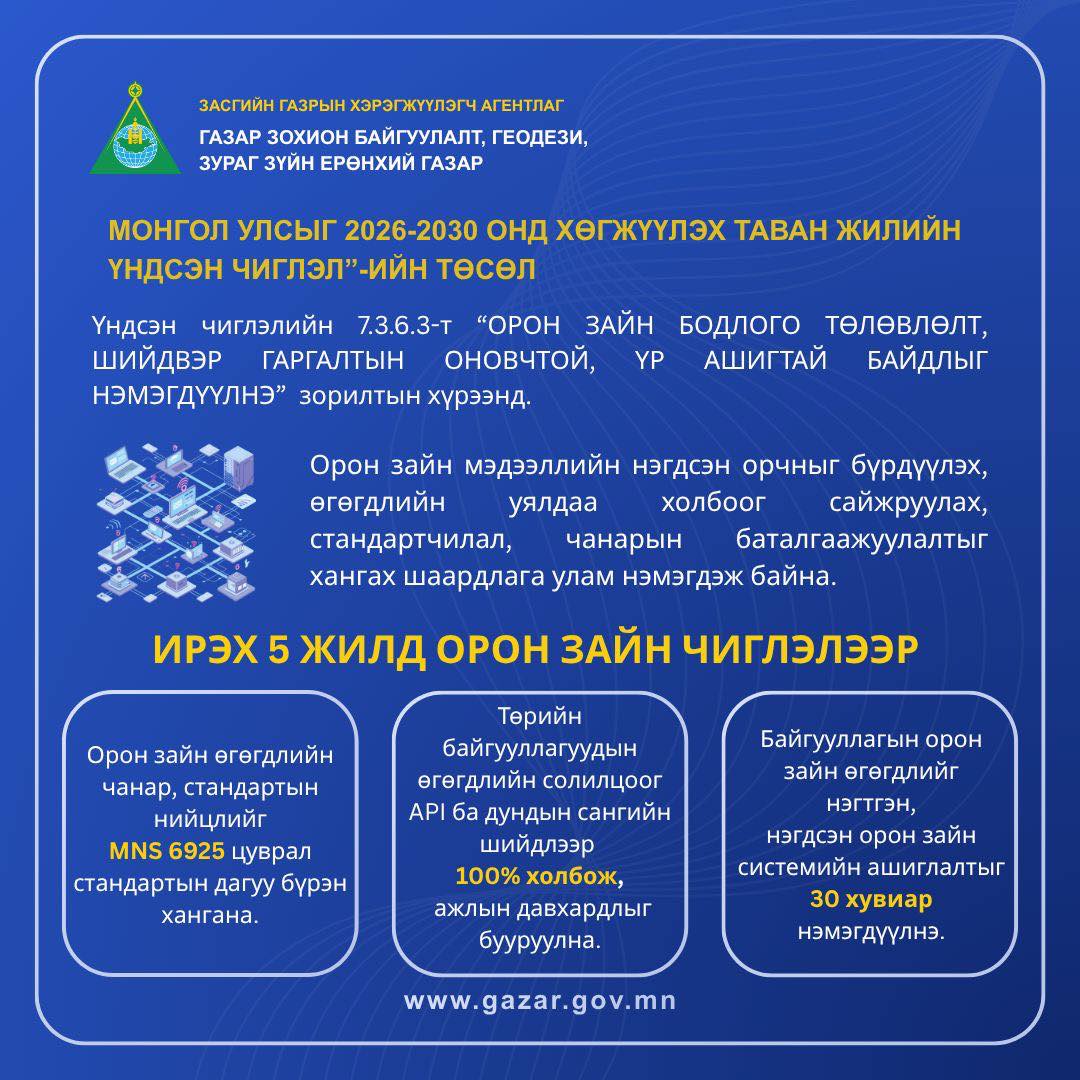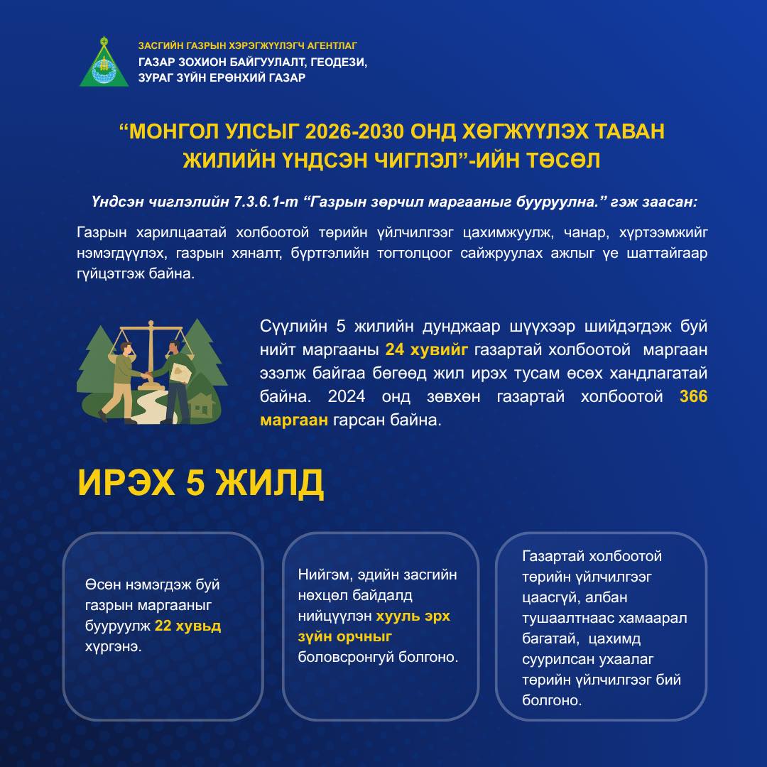 “МОНГОЛ УЛСЫГ 2026-2030 ОНД ХӨГЖҮҮЛЭХ ТАВАН ЖИЛИЙН ҮНДСЭН ЧИГЛЭЛ”-ИЙН ТӨСӨЛД ГАЗРЫН ХАРИЛЦААНЫ ЧИГЛЭЛЭЭР ТУССАН ЗОРИЛТ