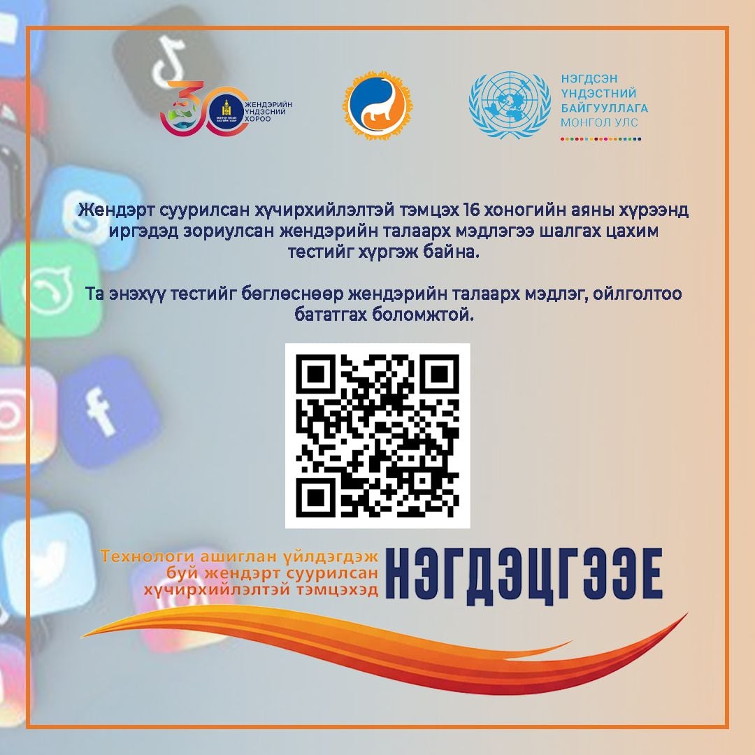 Жендэрт суурилсан хүчирхийлэлтэй тэмцэх 16 хоногийн аяны хүрээнд иргэдэд зориулсан жендэрийн талаарх мэдлэгээ шалгах цахим тестийг хүргэж байна.