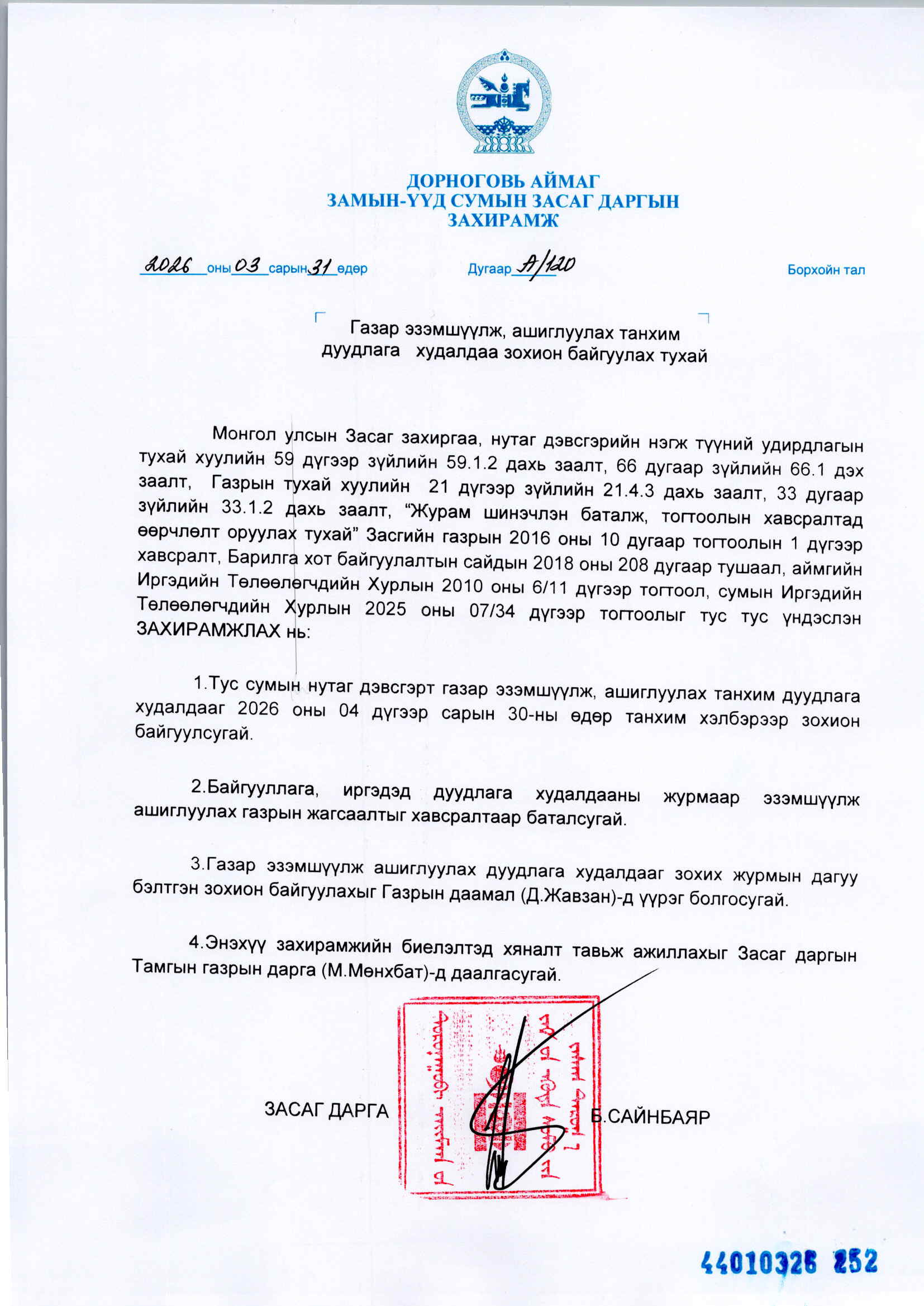 ГАЗРЫН ДУУДЛАГА ХУДАЛДААНЫ ЗАР-ЗАМЫН-ҮҮД СУМ-ТАНХИМ