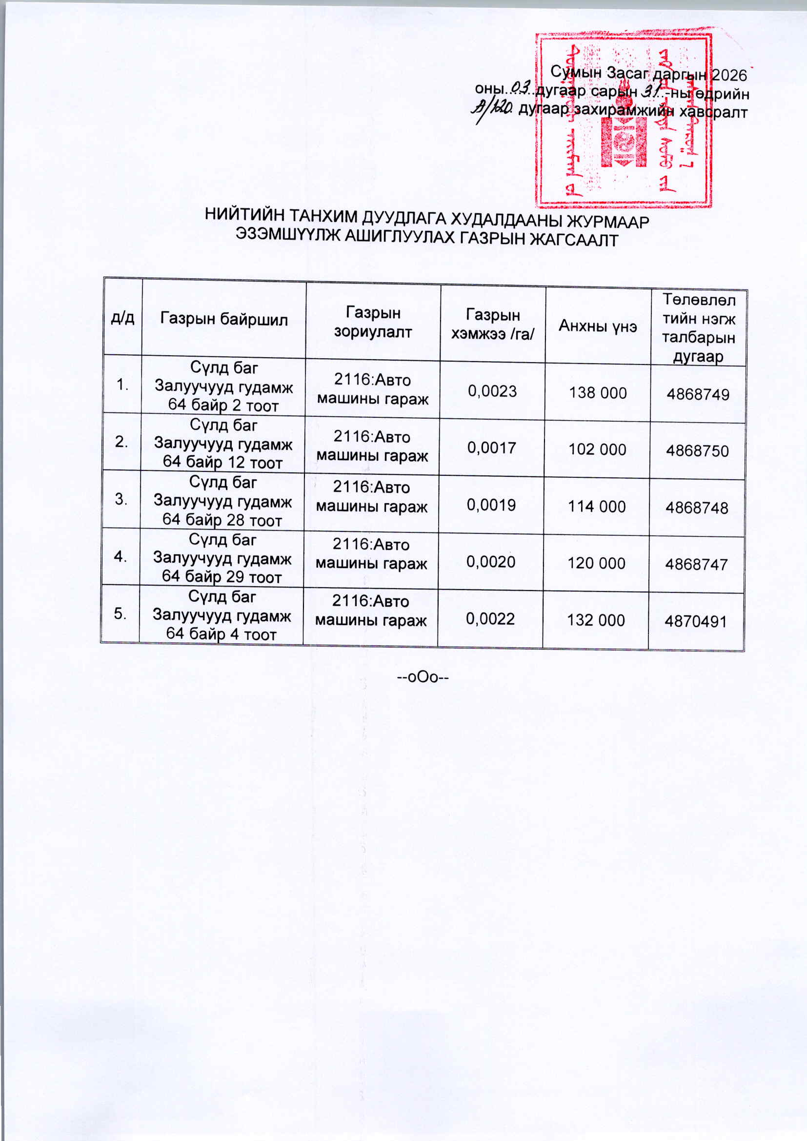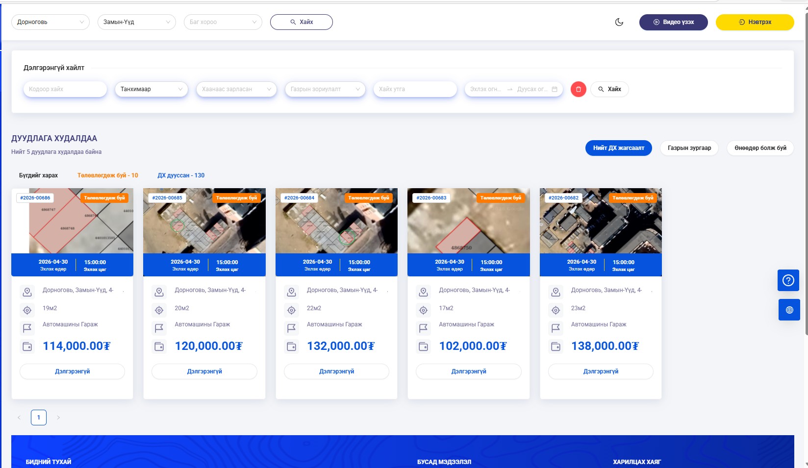 6. Иргэн, ААН-12500 төгрөгийг цахим төлбөрийн системийн www.itax.mta.mn хаягаар нэвтэрч төлбөрийн даалгавар үүсгэж тушаана. Дуудлага худалдаа явуулах газрын байршил, хил хязгаарыг харуулсан схем зураг болон бусад дэлгэрэнгүй мэдээллийг 91020011 утсаар лавлана уу.
