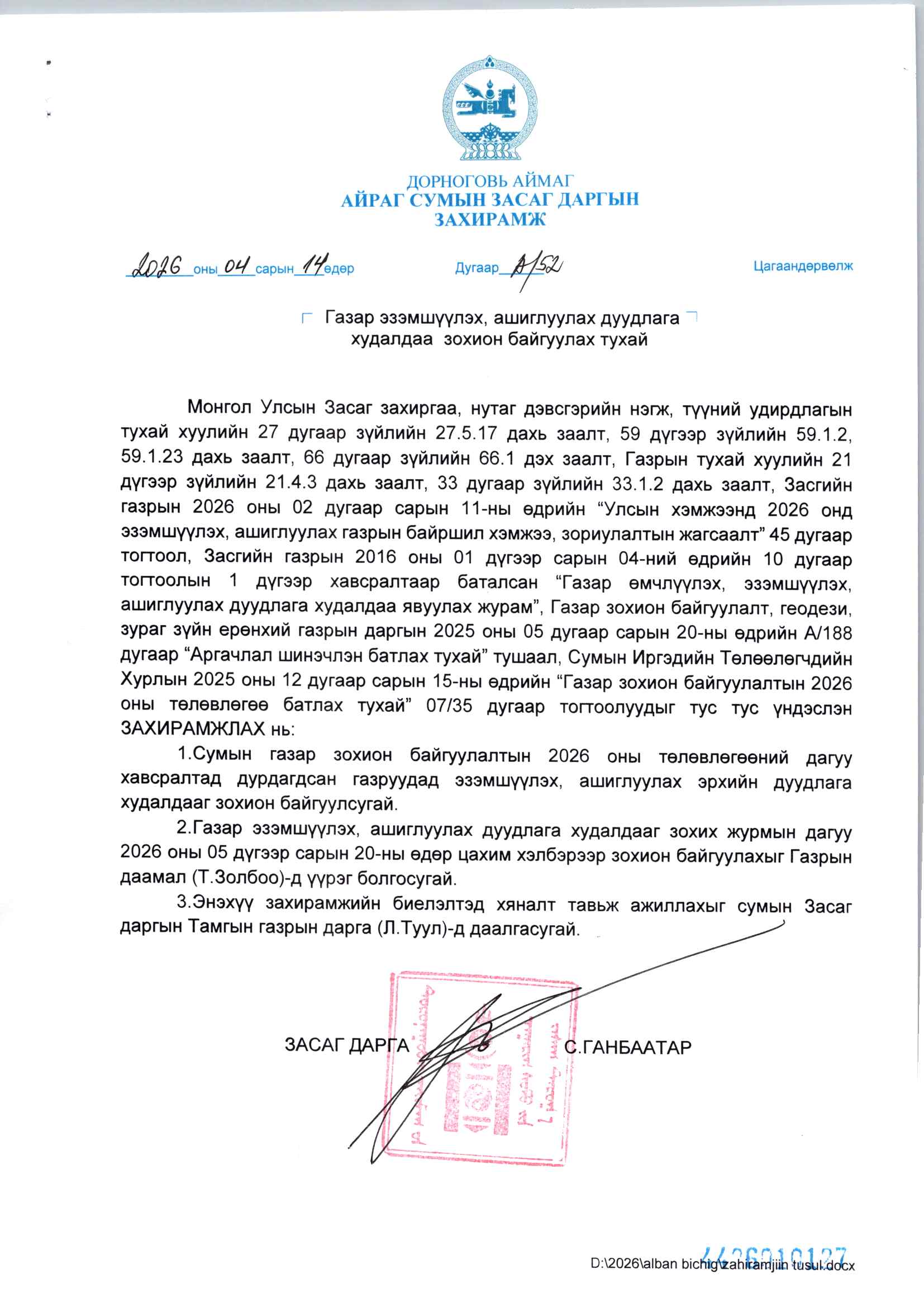 Айраг сумын Засаг даргын 2026 оны А/52 тоот захирамжийг үндэслэн дээр дурьдсан байршилтай газарт газрын цахим дуудлага худалдаа 2026 оны 05-р сарын 20-ны өдөр зохион байгуулагдана.