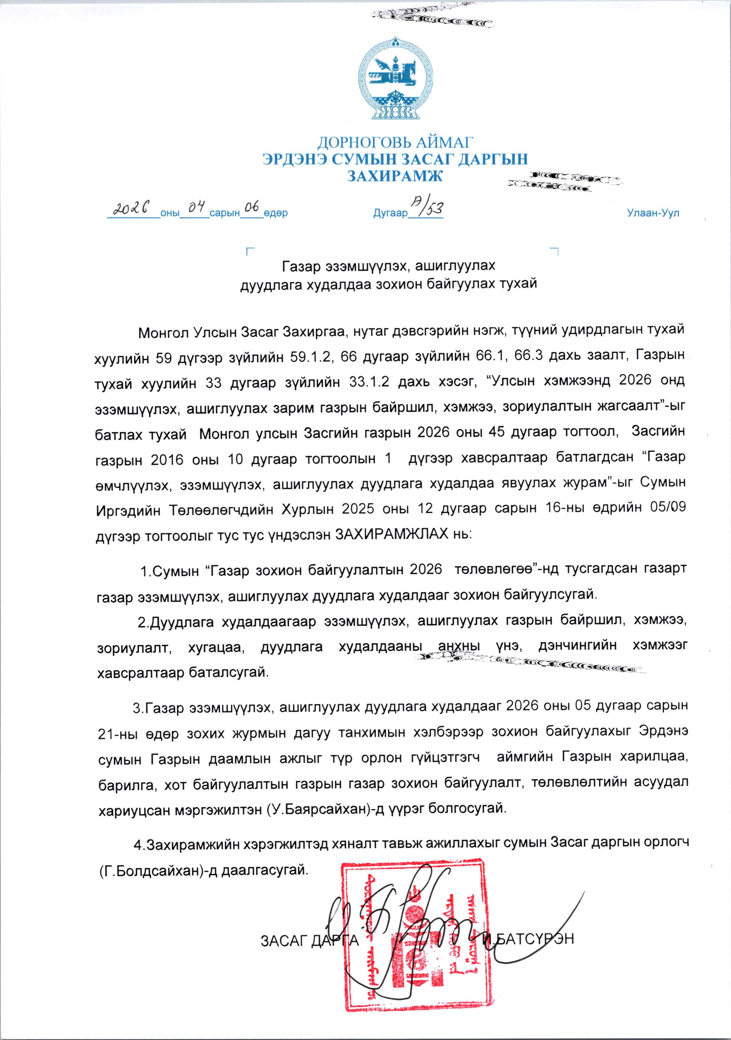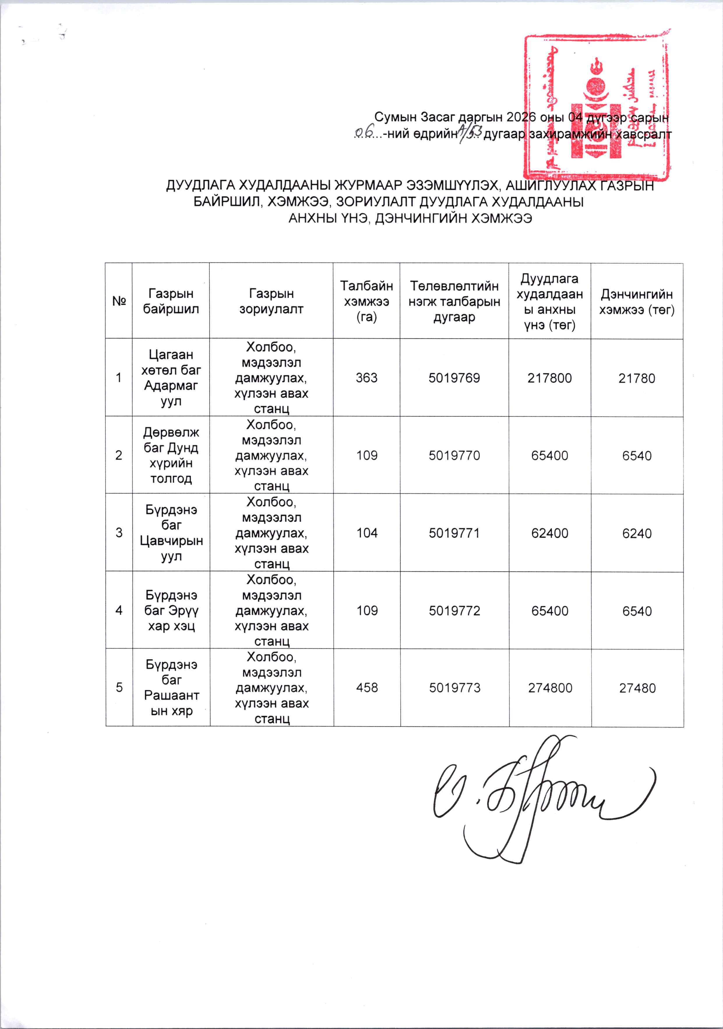 ГАЗРЫН ДУУДЛАГА ХУДАЛДААНЫ ЗАР-ЭРДЭНЭ СУМ-ТАНХИМ
