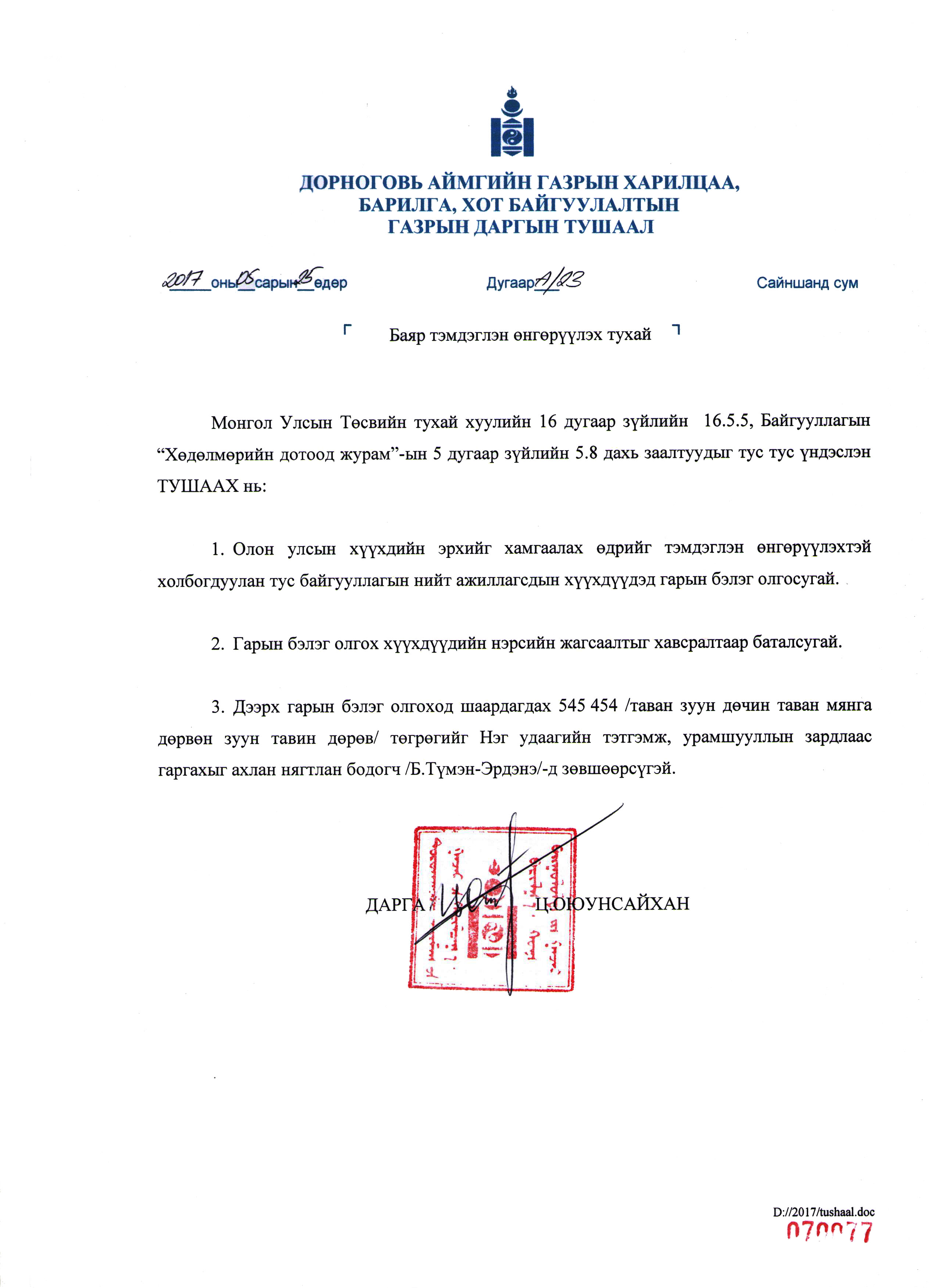 ГАЗРЫН ДАРГЫН ТУШААЛ