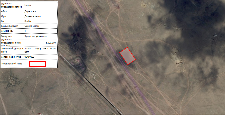 Дуудлага худалдаа явуулах газрын байршил, хил хязгаарыг харуулсан схем зураг болон бусад дэлгэрэнгүй мэдээллийг www.dornogovi.gazar.gov.mn, www.mle.mn гэсэн сайт, 99489092 утсаар болон Даланжаргалан сумын ЗДТГазар болон аймгийн ГХБХБГазраас ирж лавлана уу.